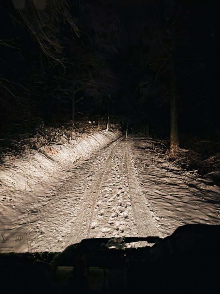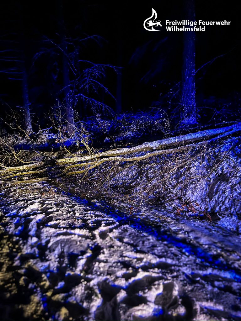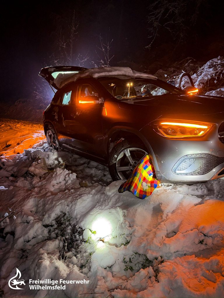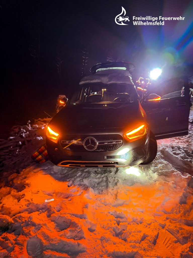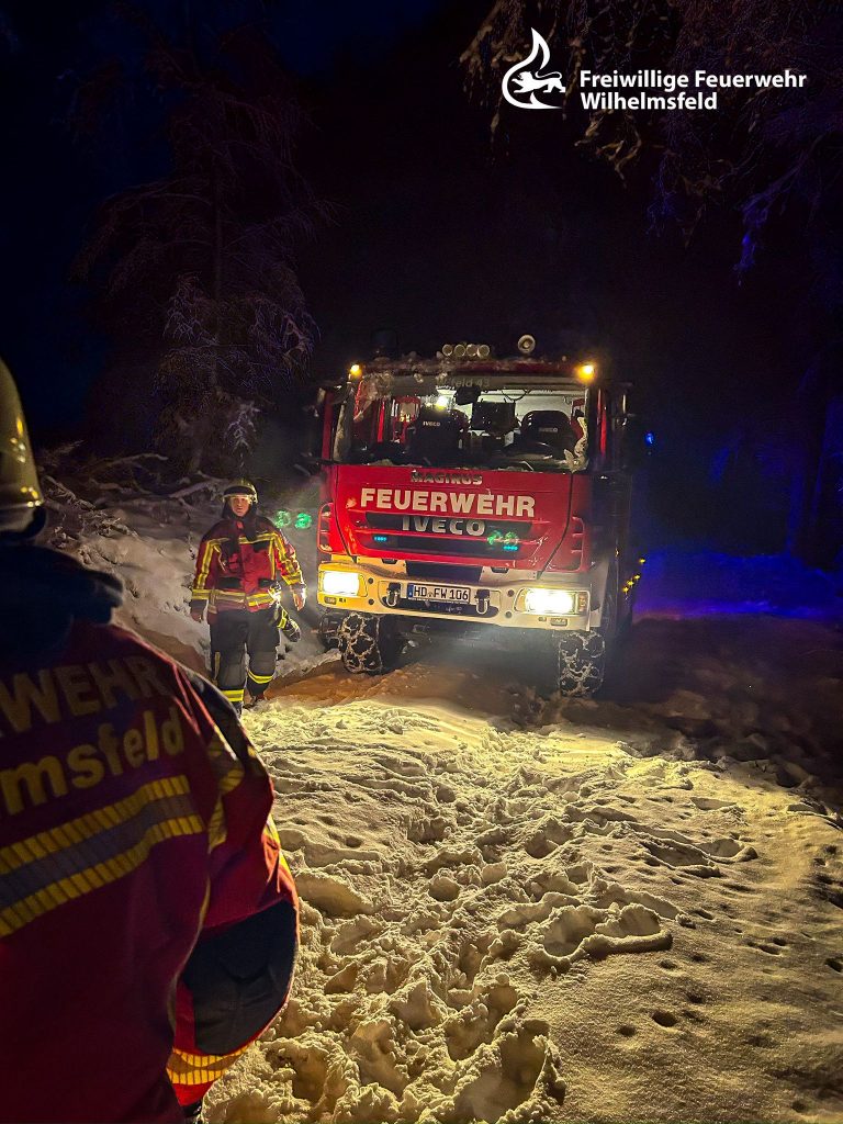 Bereits auf der Anfahrt zeigte sich, dass der Einsatz mit einigen Herausforderungen verbunden sein würde: Dunkelheit, Schnee und ein zunächst schwer auffindbarer Einsatzort erschwerten das Vorankommen. Erst durch telefonischen Kontakt und eine Standortübermittlung konnte der genaue Ort lokalisiert werden, zudem mussten auf dem Weg dorthin umgestürzte Bäume beseitigt werden. Noch während der Anfahrt erreichte uns eine weitere Alarmierung, sodass parallel Kräfte zu einem Folgeeinsatz ausrückten (siehe Einsatz 04/2026).